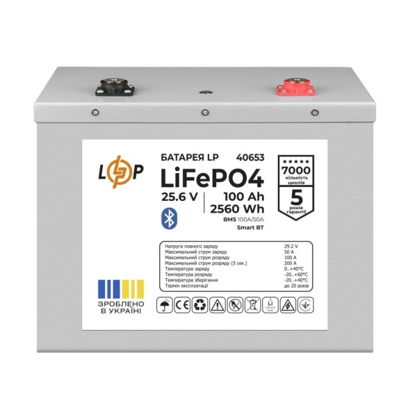 Основні характеристики акумулятора LP LiFePO4 25,6V - 100 Ah (2560Wh) (BMS 100A/50А) Metal Smart BT